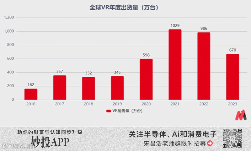 受到MR行业尚未建立优秀的应用生态以及产品本身的一些问题影响,2023年全球VR出货量仅有670万台,同比下降30%,行业的进展远低于预期。