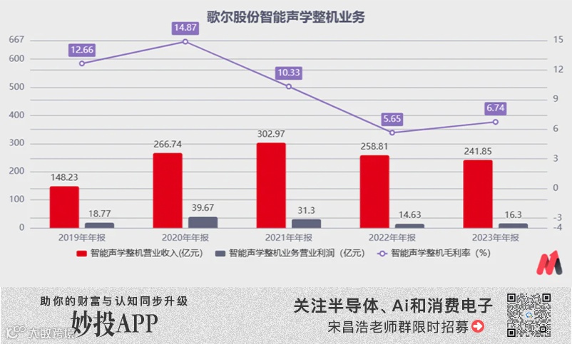 在行业发展疲软的背景下,从2021年开始,歌尔股份的智能声学整机业务增长就逐渐放缓,到2022年10月份,出现了苹果的砍单情况,歌尔股份的该部分业务营收及利润大降。