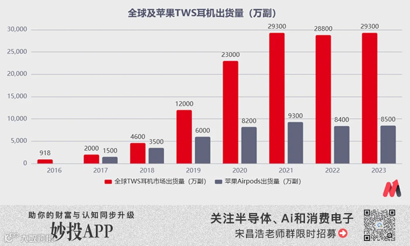 自2017年以来,随着TWS耳机的出货量快速增长,行业的渗透率基本已处于极限。到2021年达到顶峰之后,全球的TWS耳机增长开始放缓,苹果的Airpods耳机出货量同样也面临疲软。