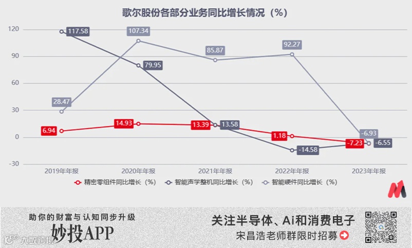 在两大下游耳机和VR双双下滑,以及手环手表等消费电子同样疲软的背景下,歌尔股份的三部分业务在2023年同比出现了负的增长,从而使得歌尔股份的业绩在2023年不及预期。