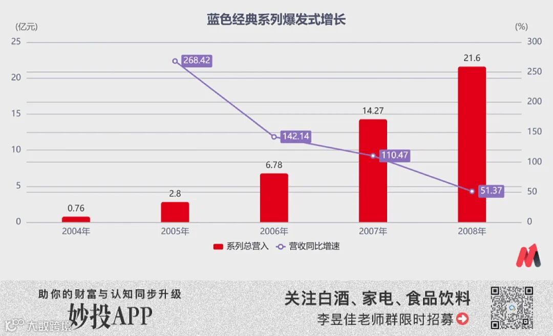 总营收从2004年的4.17亿元快速攀升至2008年的26.82亿元,归母净利润则从0.15亿元提升至2008年时的7.43亿元,5年里分别增长了543%、4853%,成为仅次于茅五泸的存在。
