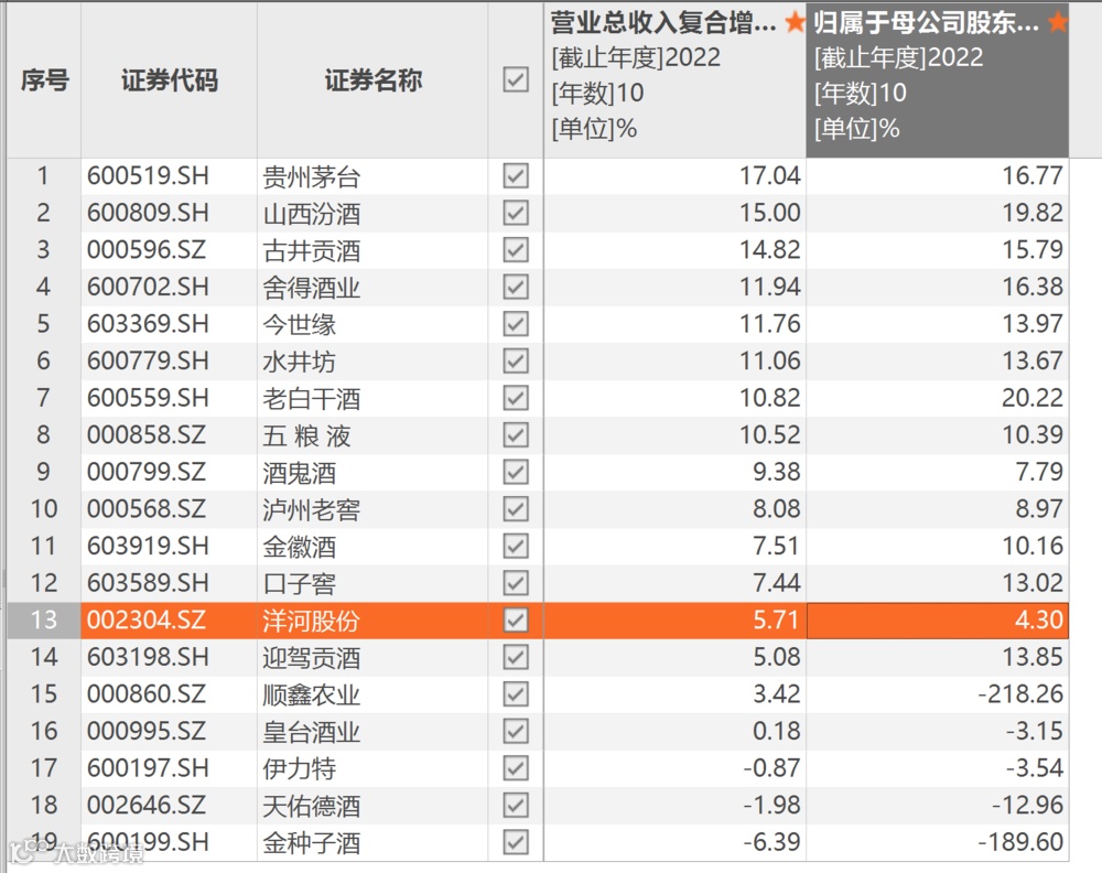 2013年至2022年的10年里,洋河股份的总营收年均复合增速只有5.71%,归母净利润年均复合增速只有4.3%,业内倒数。