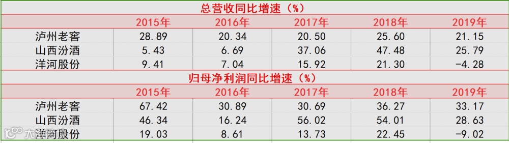 洋河股份总营收及归母净利润4年复合增速仅有5.65%、3.68%,被同样争夺白酒第三的山西汾酒、泸州老窖远远甩在身后。