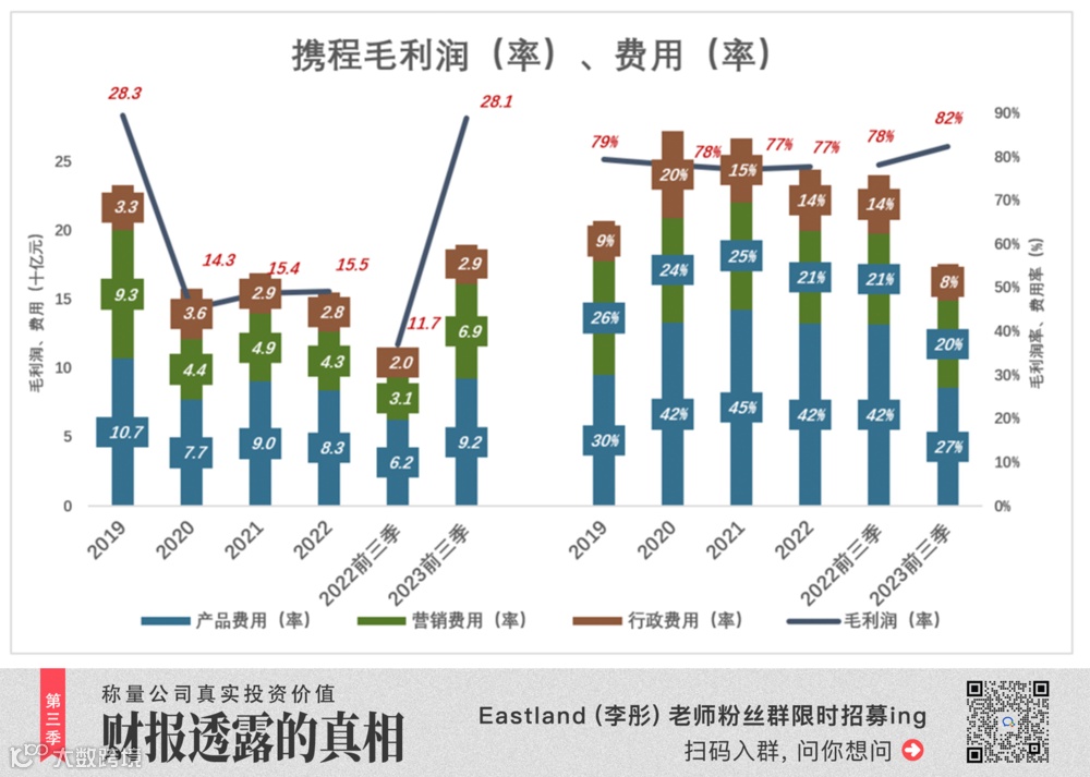2019年,携程毛利润283亿、毛利润率79.3%,产品、营销、行政三项费用合计233亿,总费用率65.2%。蓝色比彩色高50亿及14个百分点。