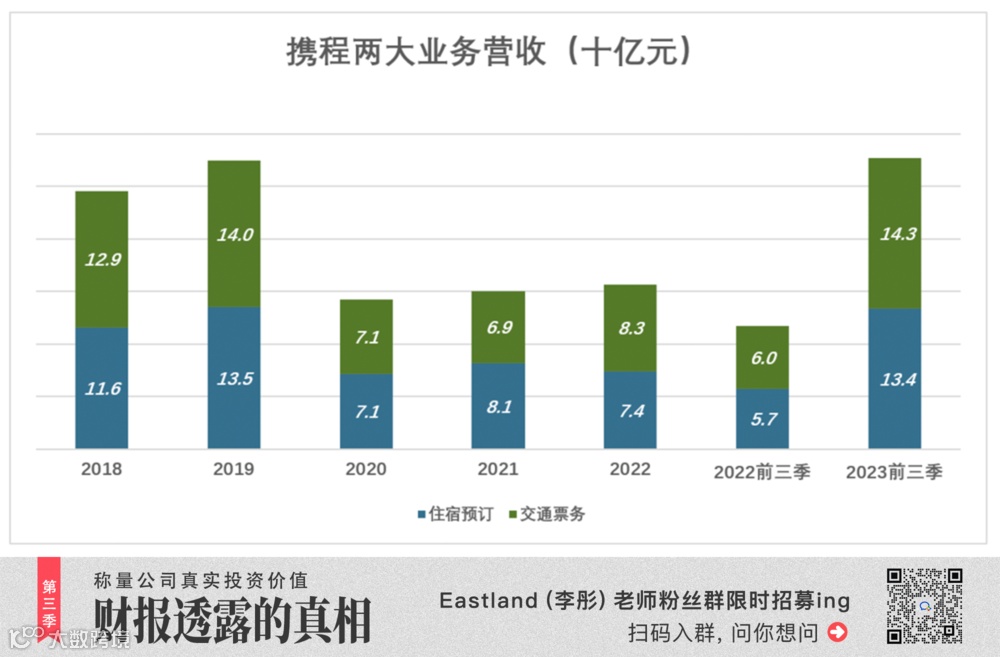 疫情前的2019年,住宿预订收入140亿、交通票务收入135亿,合计占总营收的77%。