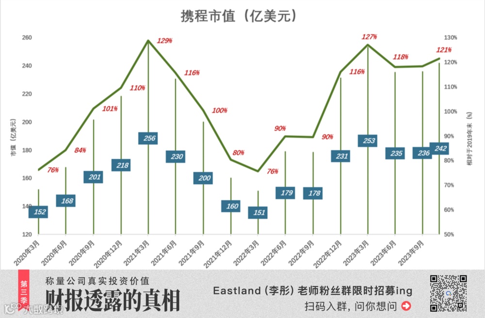 随着疫情远去,携程业绩以肉眼可见的速度恢复,市值再度攀升,2023年3月末达到253亿美元,相当于2019年末的127%。