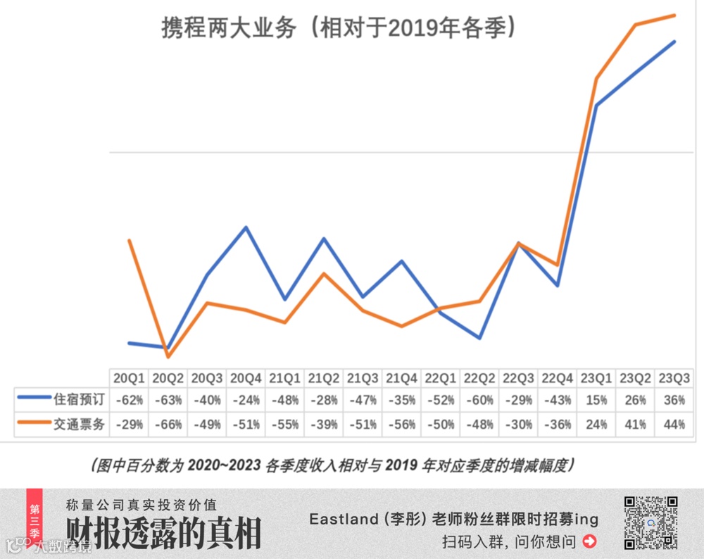 2023年前三季度,住宿预订、交通票务收入分别为143亿、134亿,超过或接近2019年全年的水平。