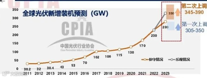 在装机需求方面,CPIA再次上调了2023年全球光伏新增装机的预期。据CPIA预测,2023年全球光伏新增装机预测为345~390GW,同比增长有望达到50%~69.56%。继2022年之后,全球光伏新增装机量再次出现高增长。