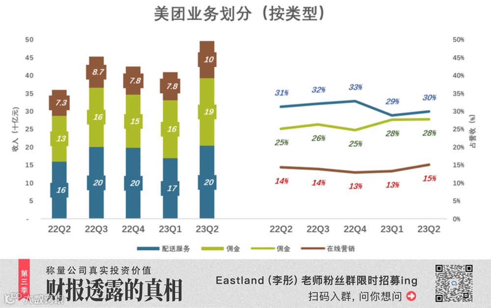 2023年Q2,配送、佣金、在线营收收入分别为203.7亿、184亿、102.4亿。它们对本地商业营收增长的贡献分别为41.1%、30.7%、20.4%。