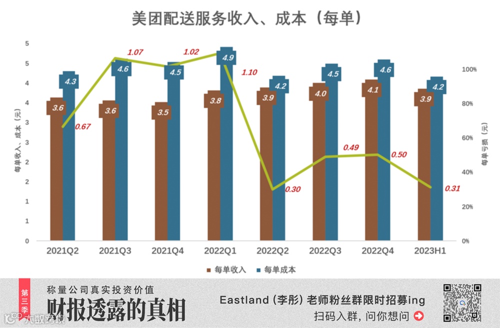 下面这张图现象地说明了配送业务与佣金、在线营销的关系。2023年H1,以配送96.7亿单为分母,每单直接亏损0.41元,每单对应佣金收入3.5元、在线营销收入1.9元,合计5.4元、估算毛利润2.24元(上半年非配送业务毛利润率为42%)。