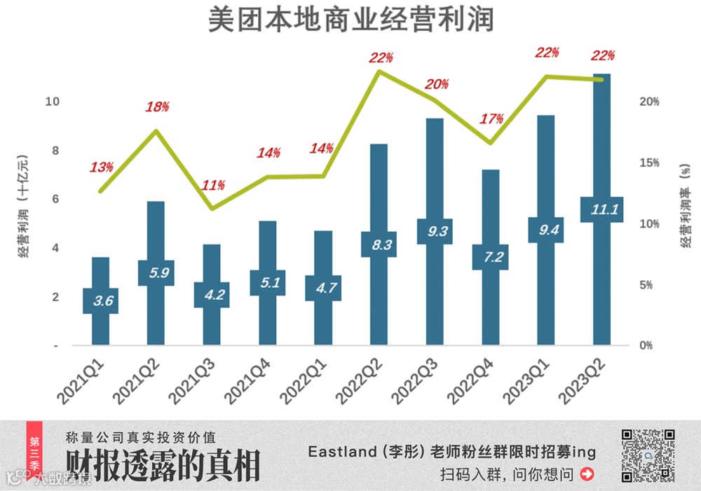 2023年Q2,本地商业经营利润111亿、利润率21.8%。过往四季度,该板块经营利润合计371亿,利润率20.2%。