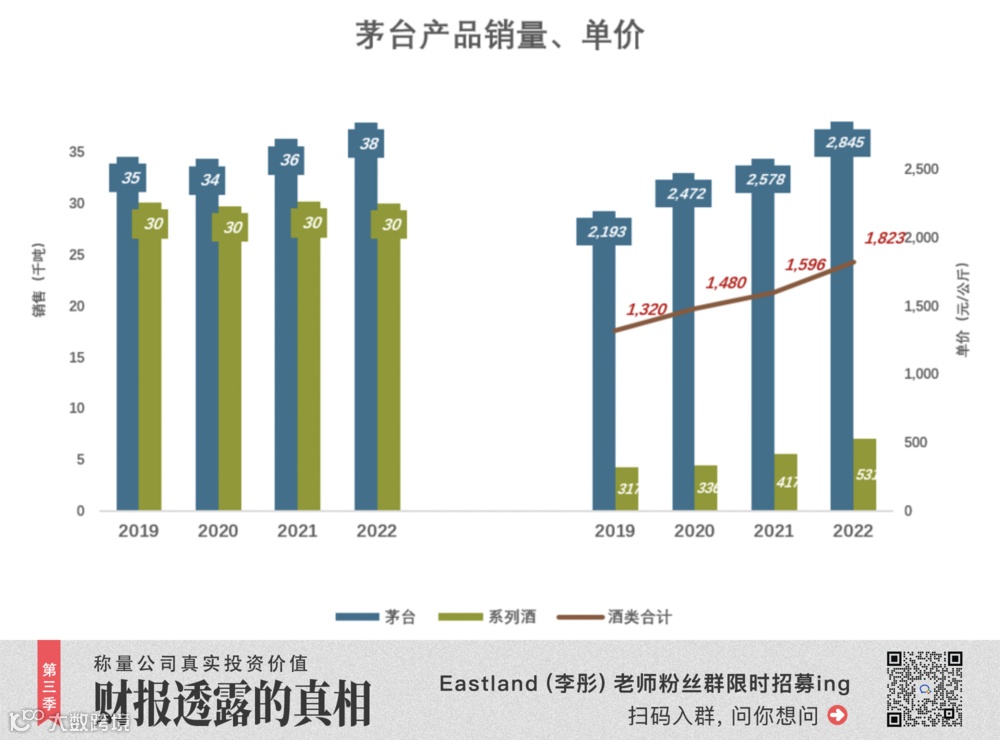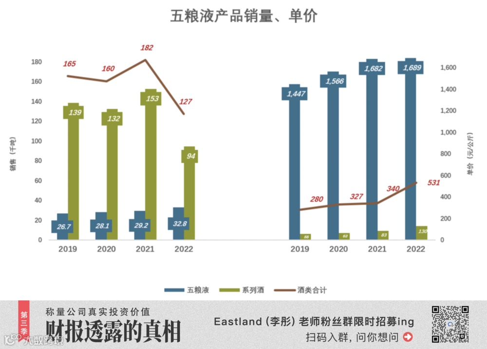 2022年系列酒销量下降30%,但单价提高57%至130元/公斤。五粮液酒销售均价为1689元/公斤、同比增幅仅0.4%。