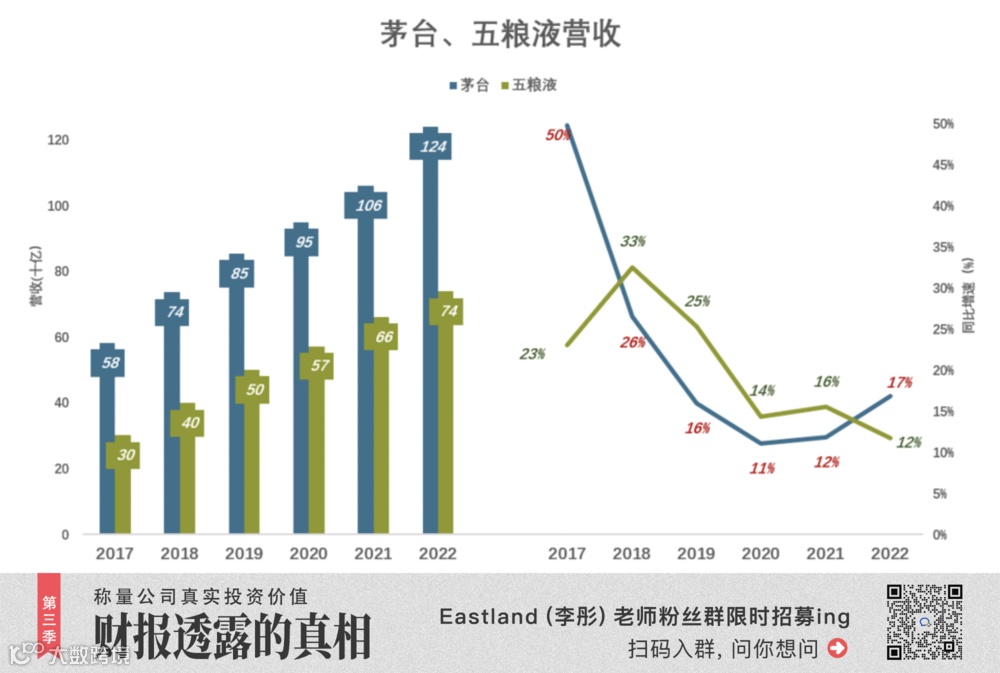 2017年,茅台营收增速冲高至49.8%。随后几年迅速回落,2020年、2021年同比增速分别为11%、12%;2022年营收1241亿、同比增速提高到17%。