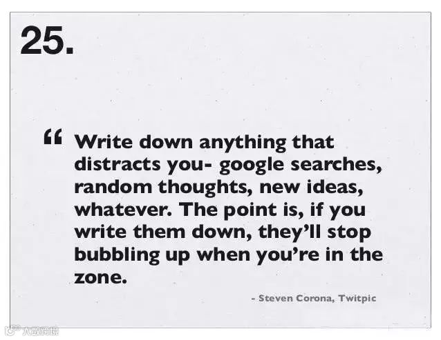 25、在工作时,用笔写下一切会分散你注意力的东西,比如一个新的创意,这样他们就不会在你的脑子里游荡