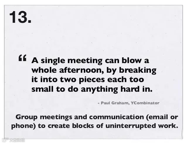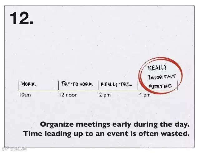 13、一个会议可能会毁了一个下午,但是如果把会议与沟通(不论是电话还是邮件的沟通)结合在一起会更有效率