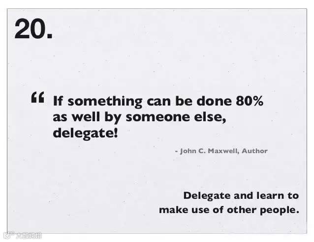 20、授权并擅用他人的力量。—君子善假于物(人)也,一个人的能力有限,要把自己的精力花在在自己职责上最重要的事情;如果有一个人可以帮忙你把一件事情做到8成,请别犹豫把项目交给他人来完成!