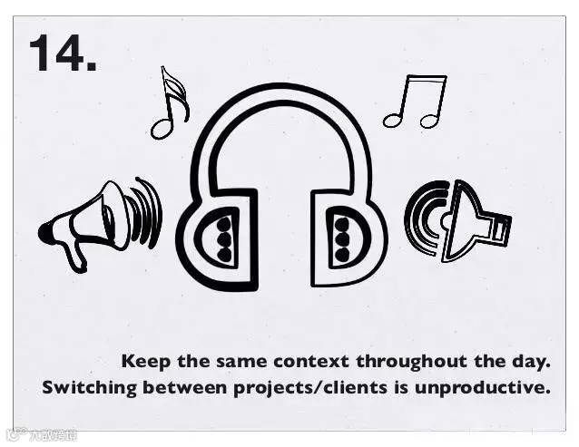 14、尽量保持每天都在同一种性质的工作下工作,切换不同性质的客户与项目并不会让你更有效率
