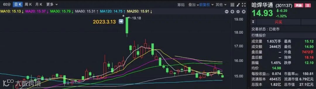 而最后一笔在2023年3月13日全仓买入哈焊华通,当天的股市如下,正好是高点。