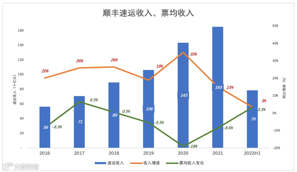 2022年H1,业务量、票均收入与2021年H1持平,分别为51亿票、 15.9元/件。
