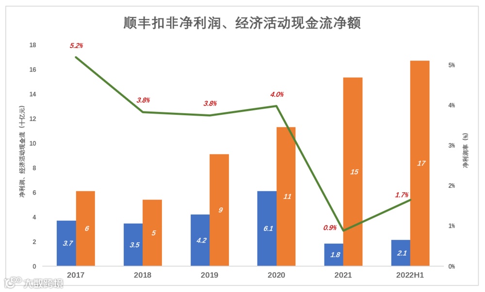 2020年,顺丰启动“以价换量”,票均收入下降19%、业务量增长35%,营收、毛利润、扣非净利润、经济活动现金流净额均创新高。
