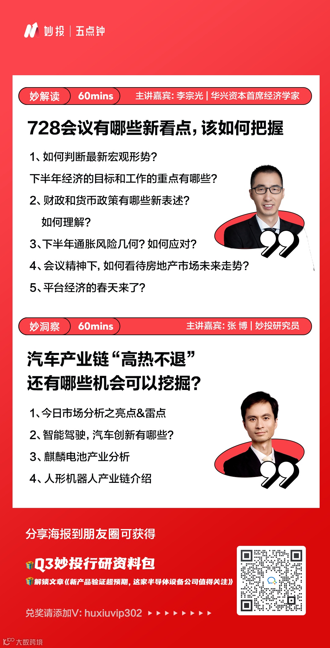 每个交易日下午5点——7点,《妙投五点钟》为您带来关于二级市场投资机会的专家直播解读,添加妙妙子微信(huxiuvip302)预约直播,还可以领取直播文档,加入妙投直播交流群,与更多投资者交流市场行情与投资机会。