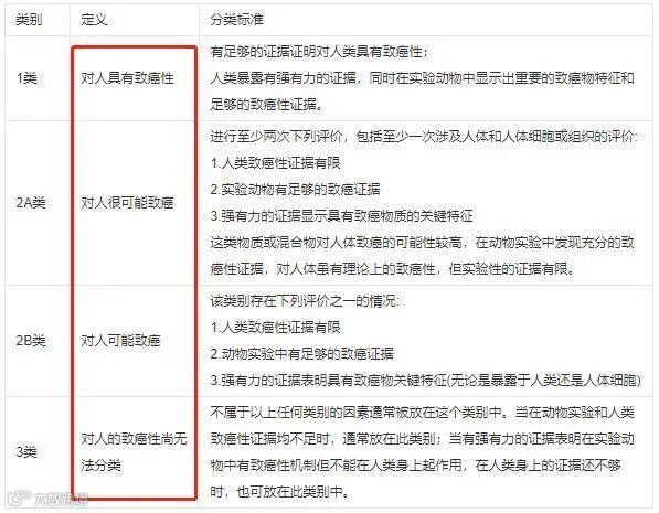 国际肿瘤研究中心将致癌物分为三类四组(1类、2A类、2B类和3类),1类是“确认人类致癌物”,即现有流行病学资料证明其为致癌物。