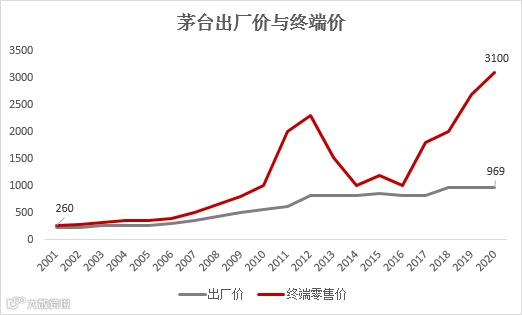在2001年茅台的出厂价与零售价基本是持平的。而截止2020年,茅台的出厂价与零售价之间相差了将近2000元。