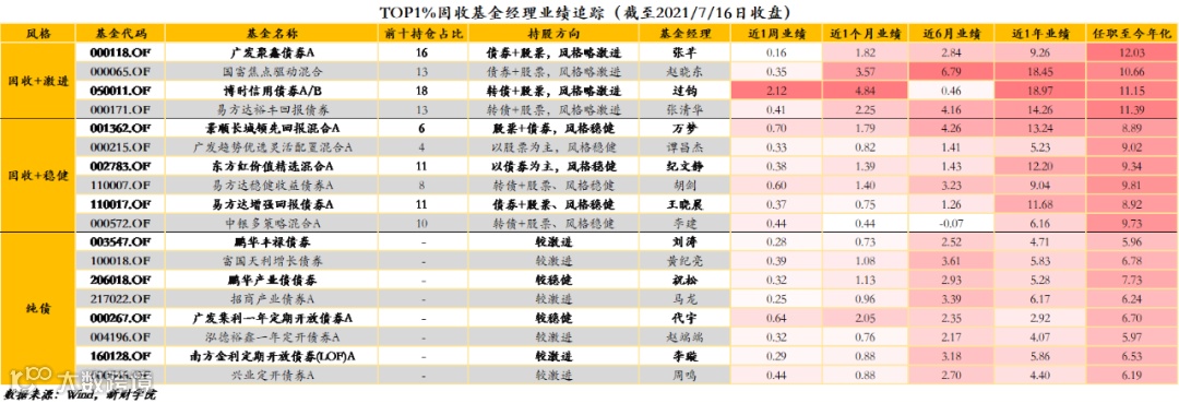 固收方向基金经理中,由于债券市场暴涨,股票市场震荡,但固收+基金经理基本表现都还不错,尤其是风格激进的过钧,由于周期方向持仓较高,本周业绩继续大涨,获得了2.12%的正收益。