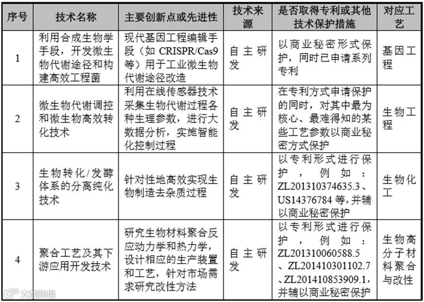 凯赛生物保有核心技术以及大量专利。公司主要借助合成生物学技术,通过生物制造方法从事生物法长链二元酸、生物基戊二胺及生物基聚酰胺等新型生物基材料的研发、生产及销售。截至2020年3月31日,发行人及其控股子公司拥有的境内授权专利120项、境外授权专利19项,目前公司在行业内的竞争中具备一定的优势地位。