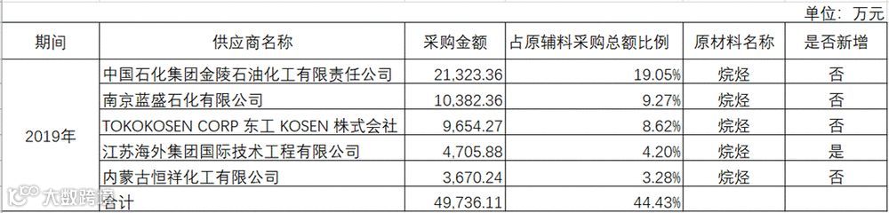 2019年公司向前五大供应商的采购金额占原材料采购金额的44.43%,其中最大供应商的采购金额占比为19.05%,最小供应商采购金额占比为4.20%,公司不存在向单个原材料供应商的采购比例占比超过50%或严重依赖于少数供应商的情况。