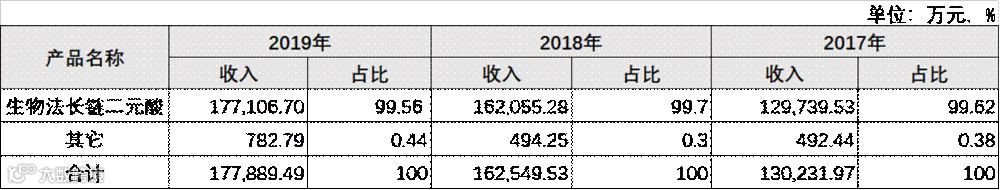 财务数据显示,报告期内凯赛生物2017年至2019年实现营业收入13.63亿元、17.57亿元、19.16亿元,营业收入的增长主要系核心产品生物法长链二元酸销量的逐年提升。公司主营业务收入同比增加 50.95%、24.82%和9.44%,收入同比增速呈现逐年递减的趋势。