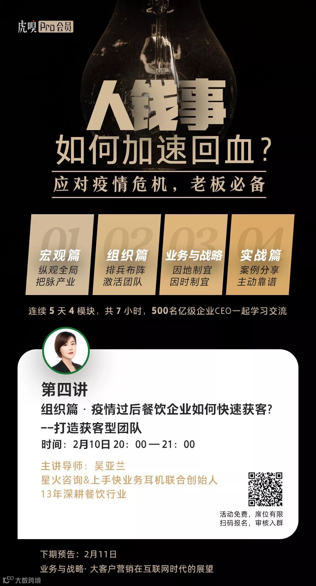 正是在这样的背景下,虎嗅Pro攒了个局,邀请了数位分享嘉宾以及500名亿级企业CEO一同,在2月8日-2月12日5天时间,以宏观篇、组织篇、业务与战略、实战篇四大模块,在线探讨 “人钱事,如何快速回血?”(我们的分享仍在继续,详情参见文末海报,感兴趣的话,速来报名吧)