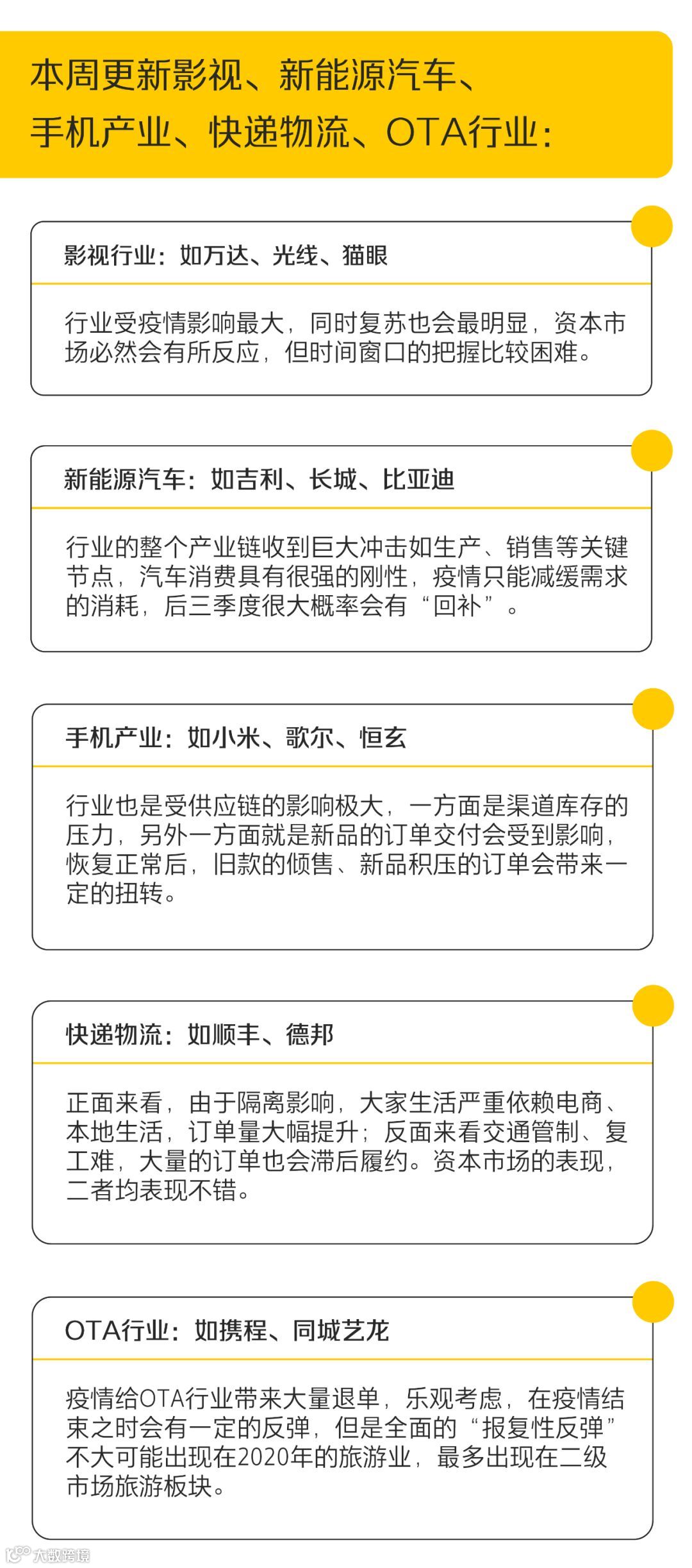 当中国经济进入“后疫情”的复苏期,哪些行业将率先复苏?哪些龙头企业能喜迎小爆发?投资者如何抓住机会不踏空?本专栏中,虎嗅研究总监李彤、主笔房煜,带领虎嗅投研团队,在A股3000多家股票中,精选出9个最有复苏潜力潜力行业中的前2、3家企业,分别对其受疫情影响程度、复苏预期、估值修复做深度剖析,帮助投资者捕捉到行业发展趋势和个股增长机会。