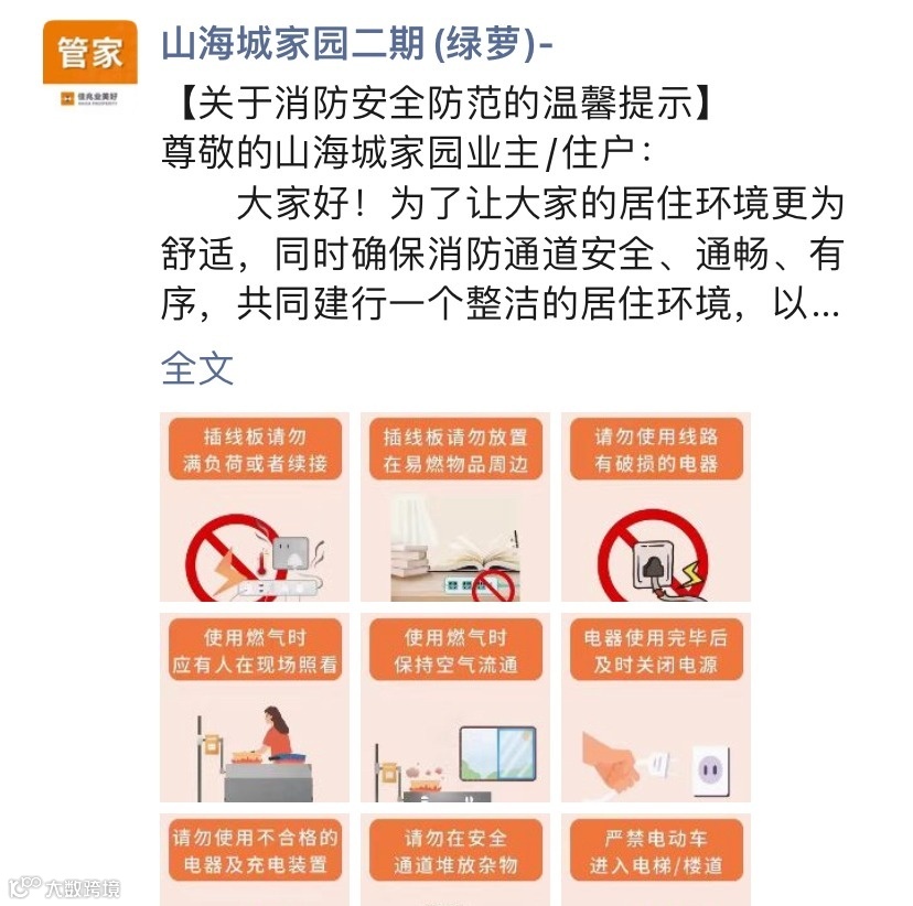 此外,各项目物业服务中心通过在管家微信朋友圈和业主群转发消防安全知识及相关注意事项、在小区内悬挂宣传标语、在公告栏上张贴消防宣传内容等等,以线上线下相结合的方式,积极营造浓厚的消防宣传氛围,让消防知识深入人心,提高业主住户的消防安全意识。多一份安全意识,多一份安全保障。