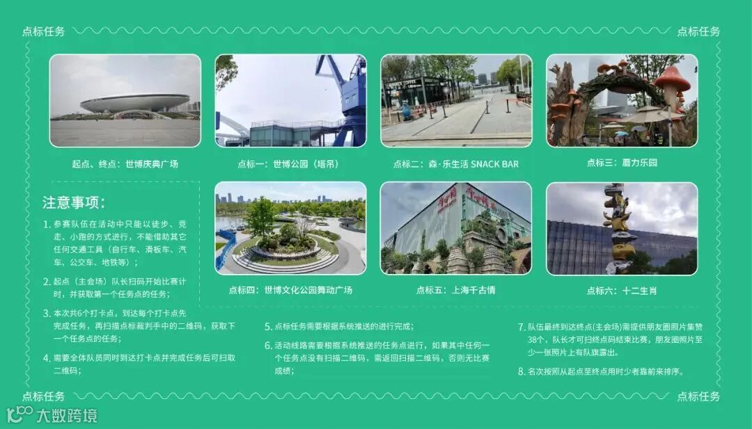 伴随着发令枪的响起,53支参赛队伍陆续从世博庆典广场出发,沿途经过世博公园(塔吊)、森·乐生活 SNACK BAR、蘑力乐园、世博文化公园舞动广场、上海千古情、十二生肖六个点标,并由各队员共同完成智慧拼图、建筑搭建、党建知识竞赛、合力建塔、一圈到底、摩斯密码、拍照发朋友圈等任务环节后,再次回到世博庆典广场顺利完赛。竞赛全过程约为6公里。