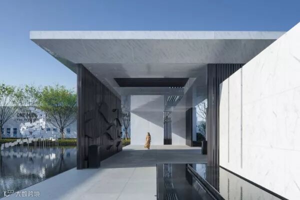 入口门廊延续了景墙的白色,形成干净利落的L型折线。光透过深色的格栅,被剪成一条条光影,落在墙上就成了折线,落在水里就成了倒影,斑驳摇曳。