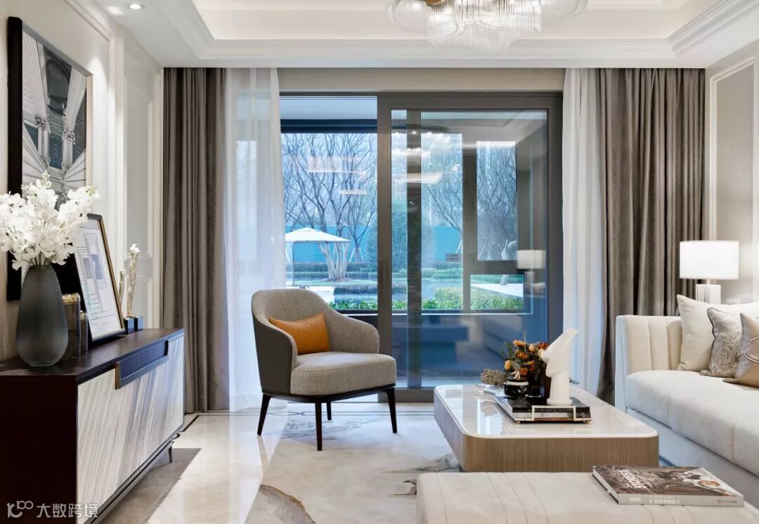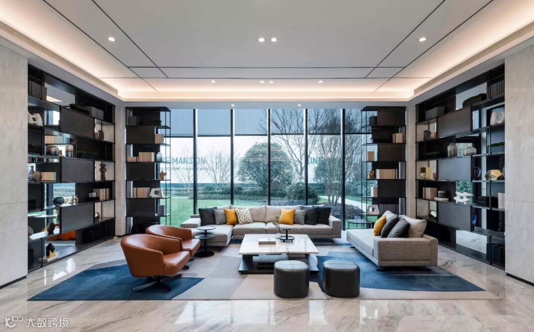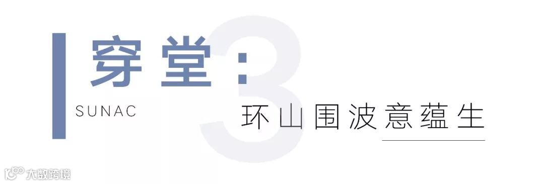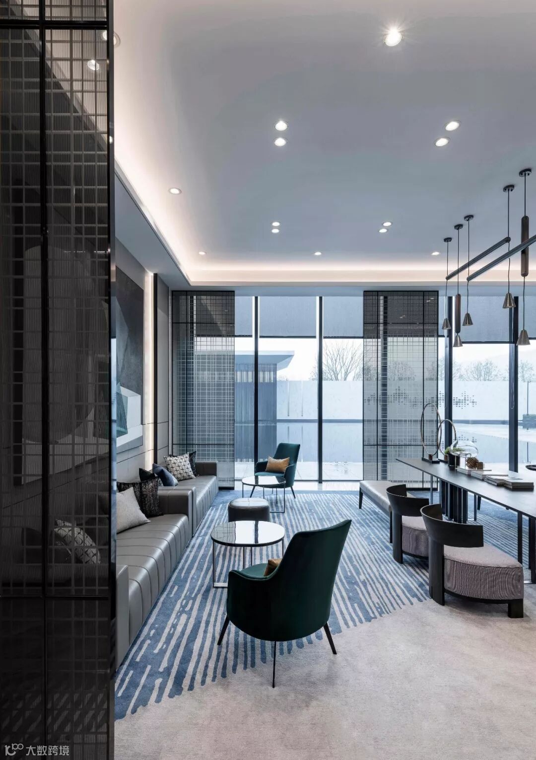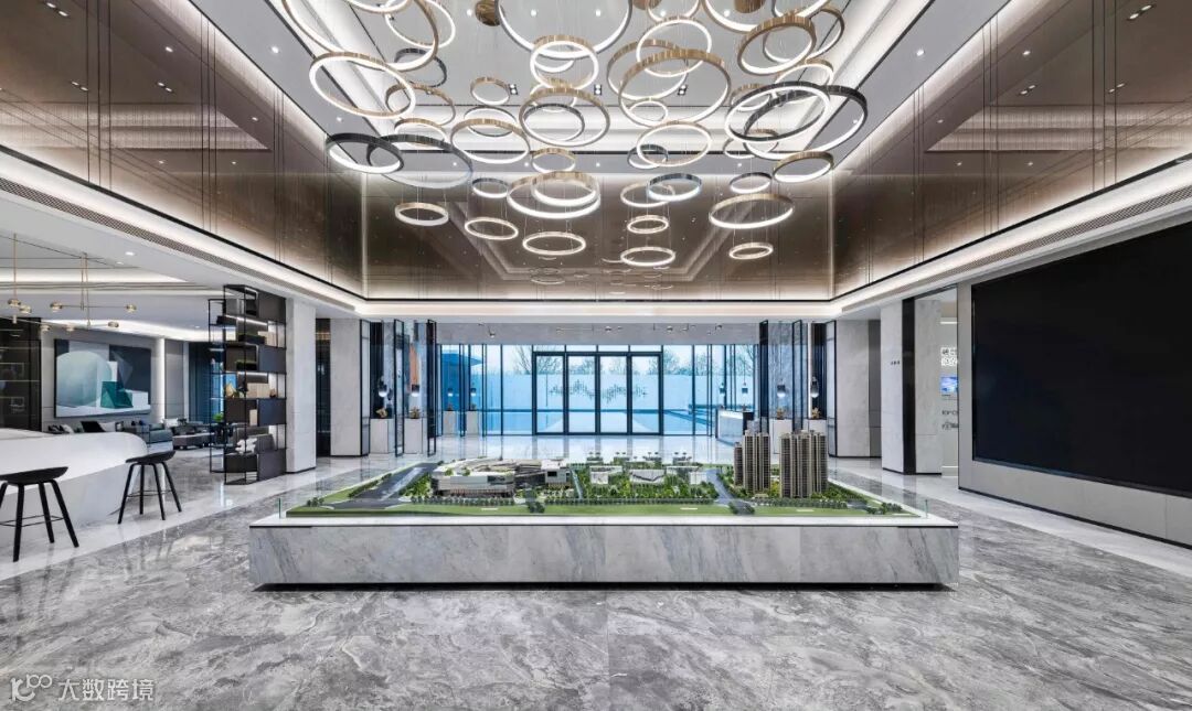 走进售楼处,就从微热过渡到了微凉,室内通过现代的设计语汇演绎形成环山围波之感。