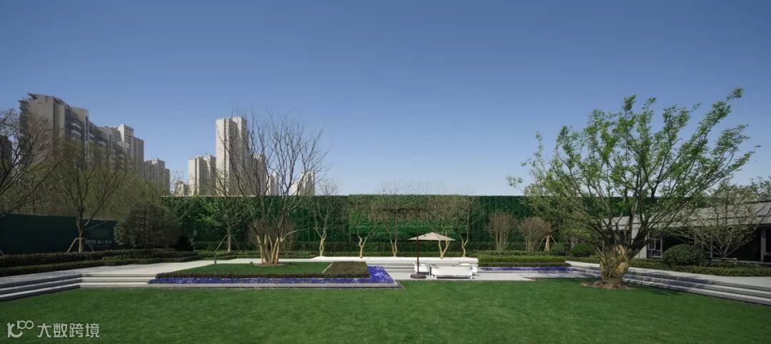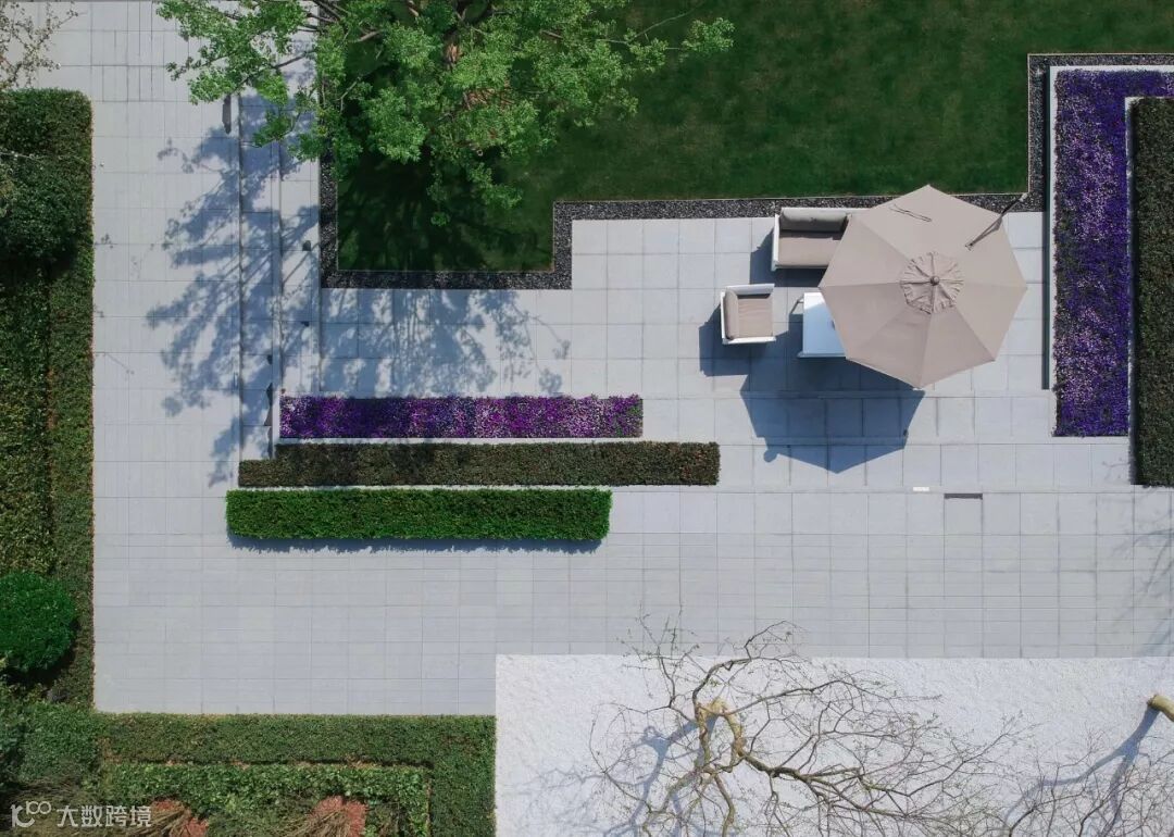 转折后就别有一番洞天了。一大片开阔的草坪跃然呈现,道路与下沉式草坪通过台阶和层级植坛自然衔接,草坪对景设置了不同形态的乌桕,与周围翠绿的围墙相得益彰。