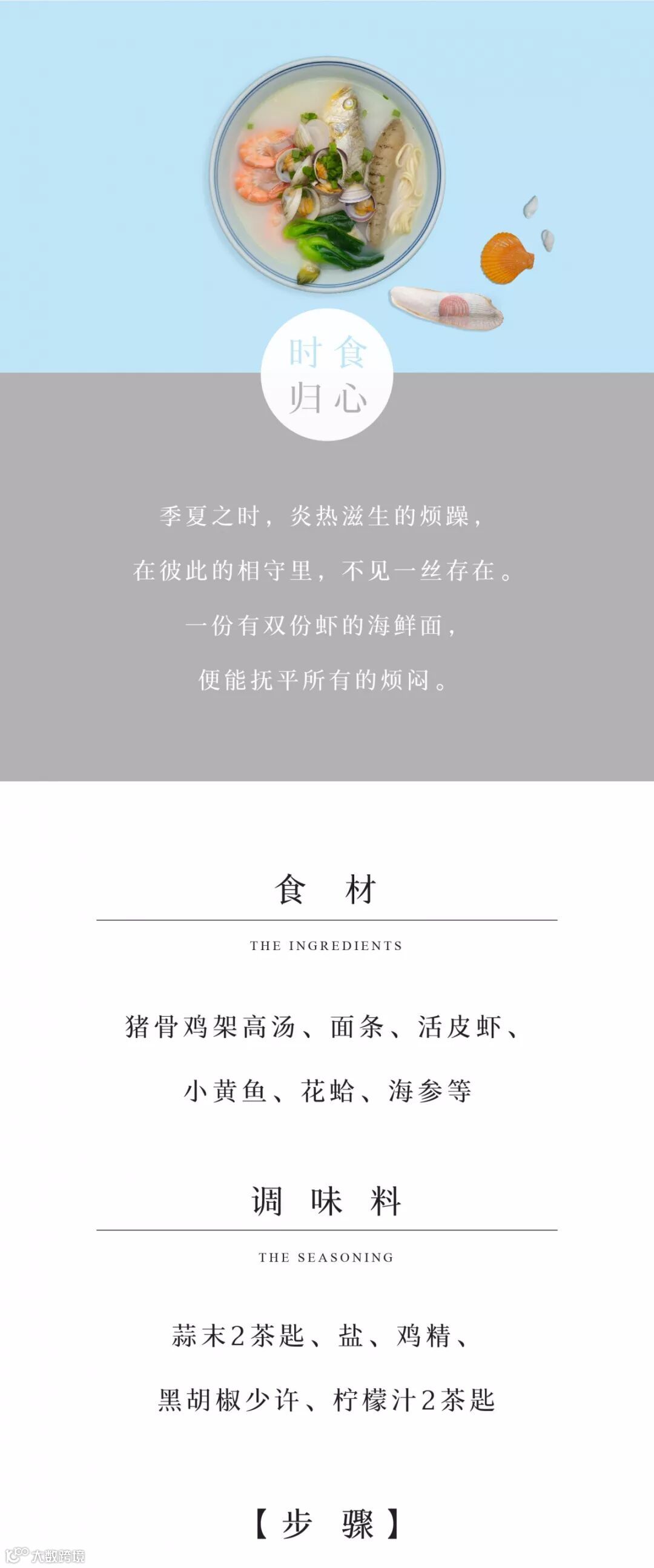 3、面条的形状以及其中的海鲜可以随喜好任意更改。