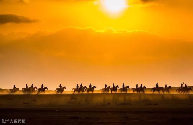夕阳下奔跑的马队