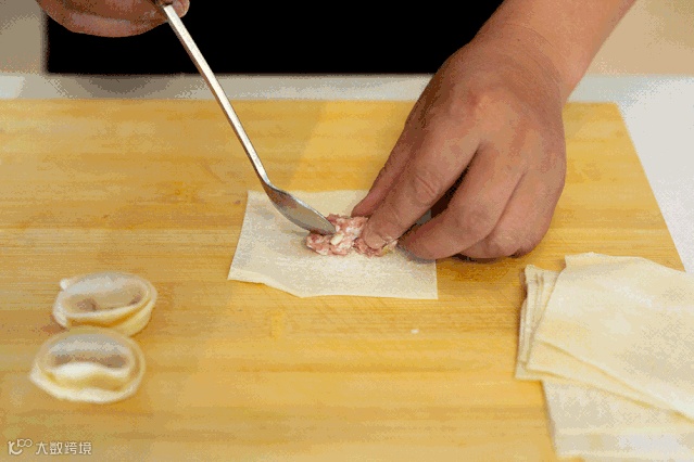 2.面粉制成100张馄饨面皮,逐张包入肉馅,包成突肚、翻角略呈长方形的馄饨。