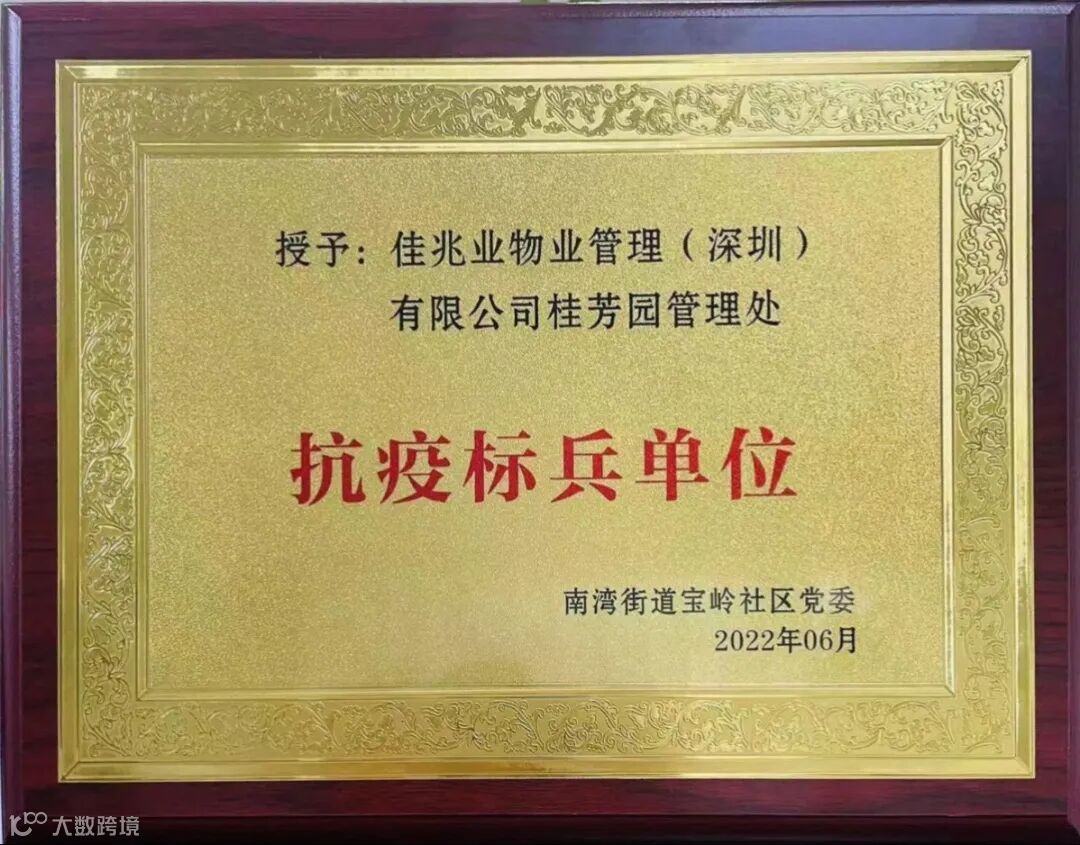 佳兆业美好深圳分公司桂芳园项目荣获南湾街道宝岭社区党委授予的“抗疫标兵单位”奖牌。