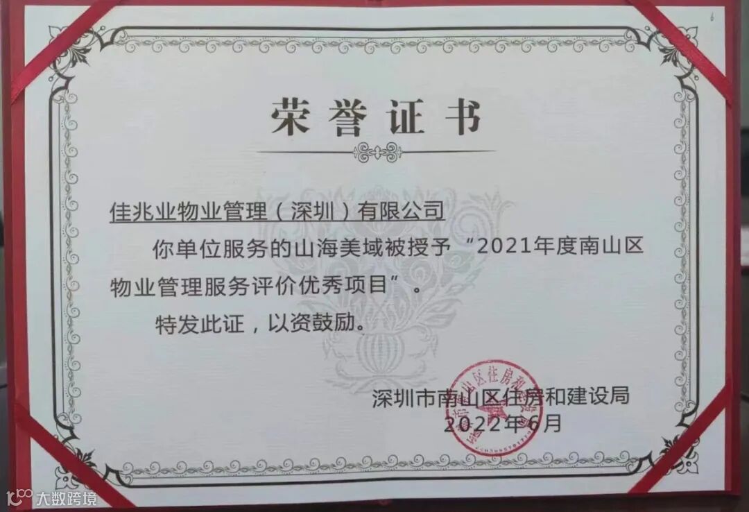 佳兆业美好深圳分公司山海美域项目荣获“2021年度南山区物业管理优秀示范项目”。