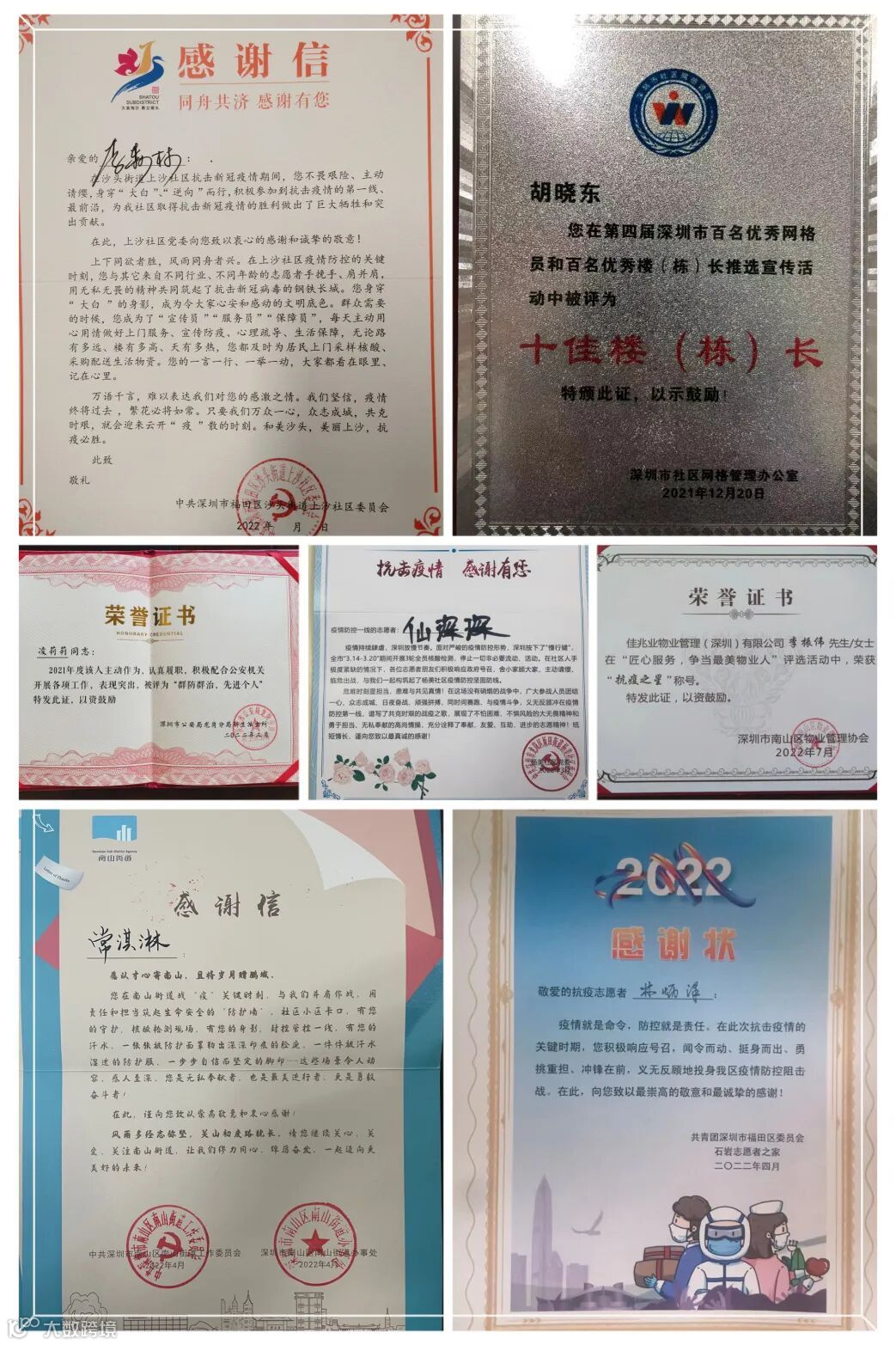 深圳分公司与项目单位屡获殊荣,同时,深圳分公司共有49人在二季度以来荣获“群防群治先进个人”、“十佳楼(栋)长”、“抗疫之星”、疫情防控感谢信等各类个人荣誉奖项,全力以赴成就更好的自己。