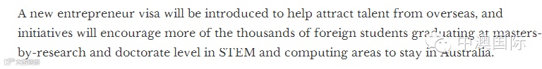 一个新的企业家签证将被推出,以帮助从海外引进人才,并计划将鼓励更多的研究类硕士和博士以及计算机领域方面的外国学生来到澳大利亚。这也许将意味着澳大利亚政府对于457雇主担保类签证政策的放宽。