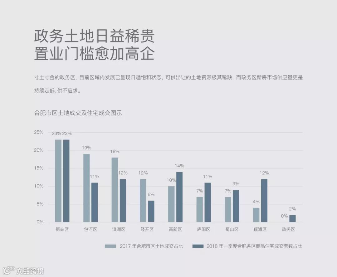 土地作为城市发展的资源载体,不可再生性决定了稀贵的价值属性。政务区作为合肥面向世界舞台的封面,板块能级引领迭代的同时,土地开发也愈渐饱和。据安徽楼市发布的合肥土地成交宗数统计数据,自2010年至今,政务区近8年时间里仅推出12宗居住用地,位居合肥九区之末。