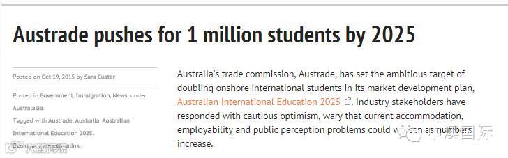 The PIE News报道,澳洲贸易委员会(Austrade)于20日公布了《澳洲国际教育2025计划》。这份野心勃勃的海外留学生计划显示,到2025年,澳大利亚的留学生将增长至100万人