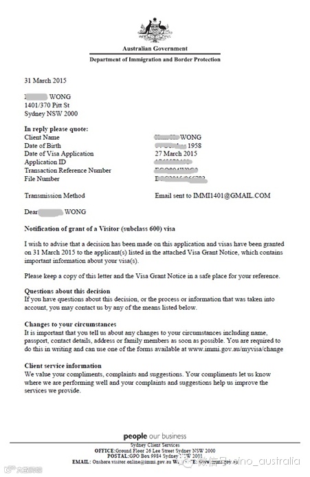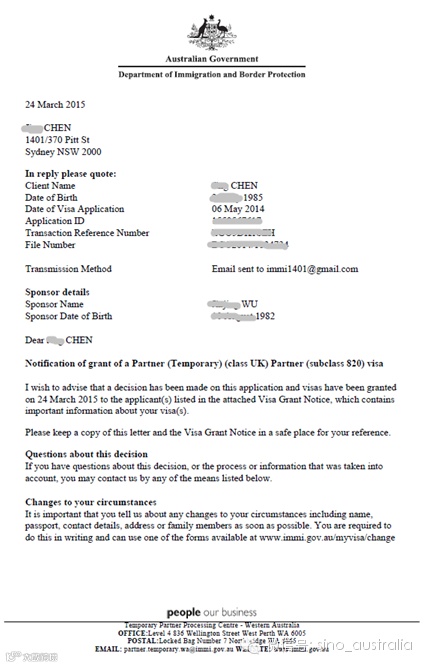 恭喜陈小姐获得配偶签证。陈小姐本身持学生签证,因同居男友为澳洲永久居民,并愿意担保她申请配偶签证,所以陈小姐直接在境内申请并等待配偶签证结果。在等待约10个月后,陈小姐顺利获签!