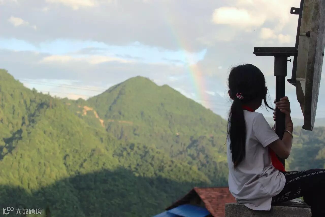 渐渐暗下来的天色突然间变得明亮,因为此刻正有彩虹出现。小女孩张应婷惊喜地望向天边。