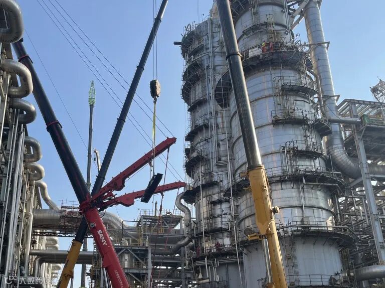 丙烯塔B塔气相新管线更换完成,新管线直径0.7米、总长度108米、总重量41吨,虽然重量不大,但需精准对接至丙烯塔120米的高空位置,吊装难度与精度要求极高。管线卧式预制、立式安装,采用“单主机抬吊递送法”进行吊装作业,主吊选用500吨履带吊,搭配100吨、80吨汽车吊辅助溜尾。此次更换将原DN500旧管升级为DN700新管,可显著提升丙烯输送效率,助力装置突破产能瓶颈。